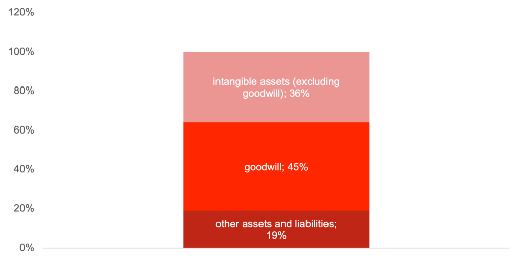 The contribution of positive goodwill (the excess of the purchase price over the value of the assets acquired) and intangible assets to the creation of corporate value is, in principle, significant. A review of the extant literature [2] indicates that, on average, this share for the market as a whole can reach 81%, and for some sectors, account for the entire value. Examples of such industries include the life sciences sector and the healthcare sector. In the case of the indicated industries, the indicated industries were responsible for the entire enterprise value of the companies, together with covering the identified gap between the excess of liabilities over assets. This is because these entities are characterised by generating losses in the initial phase of operations and financing their activities with debt capital, which results in the excess of the value of liabilities over the value of assets, i.e. a negative net asset value. The subsequent charts illustrate the examples describe