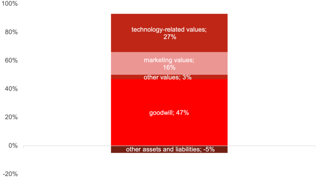 - intangible assets not identified in the balance sheets as book values, which most often include the previously distinguished components,